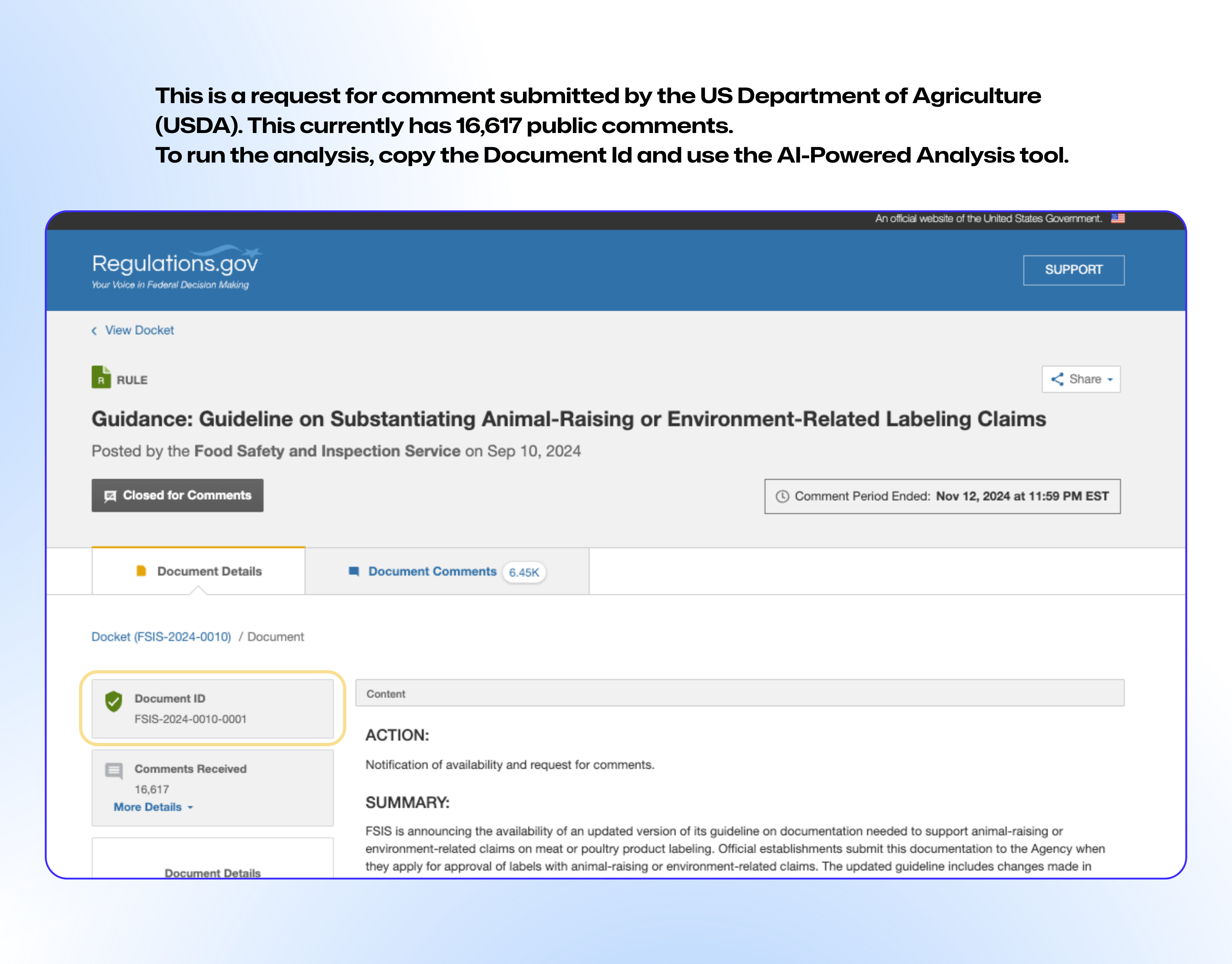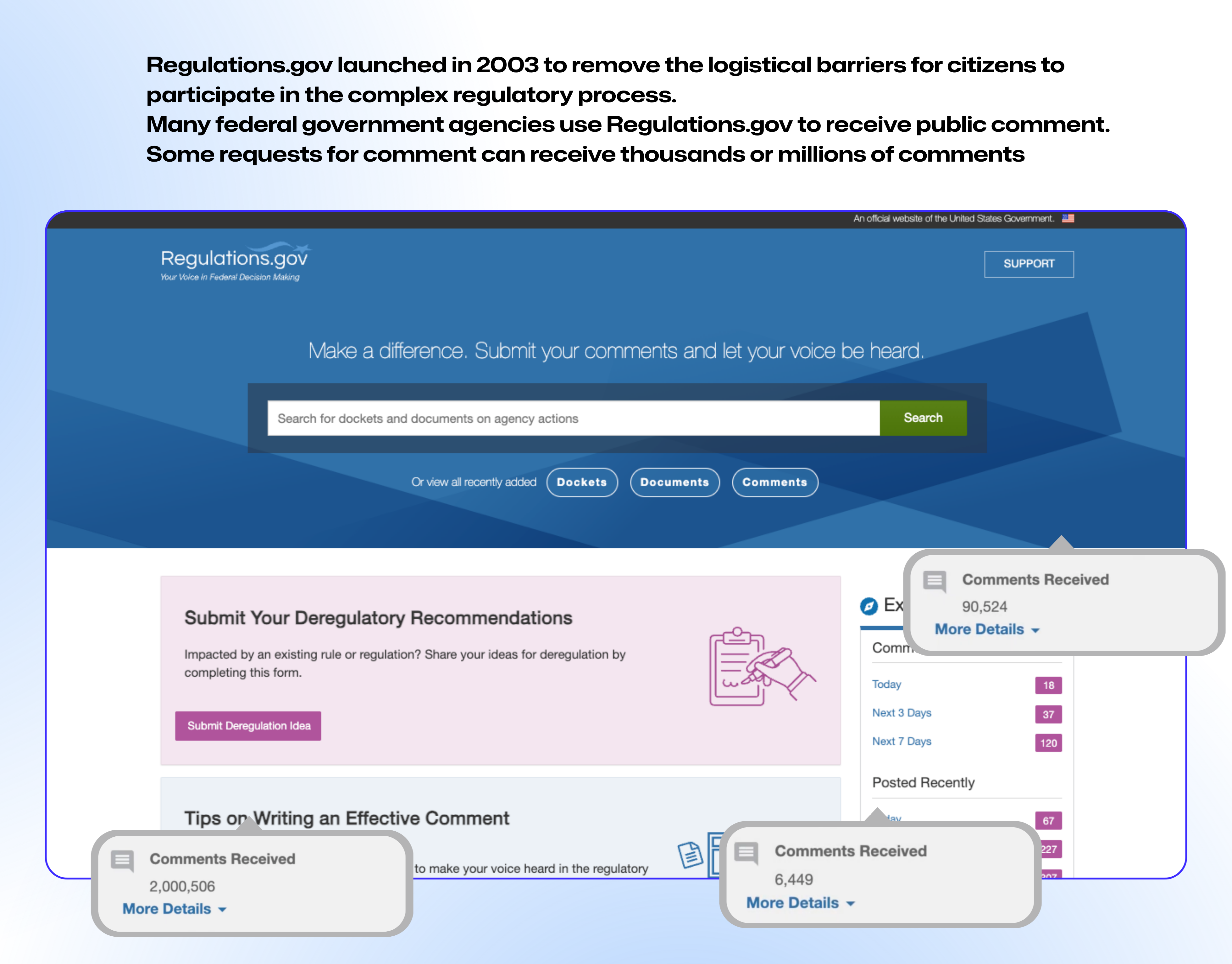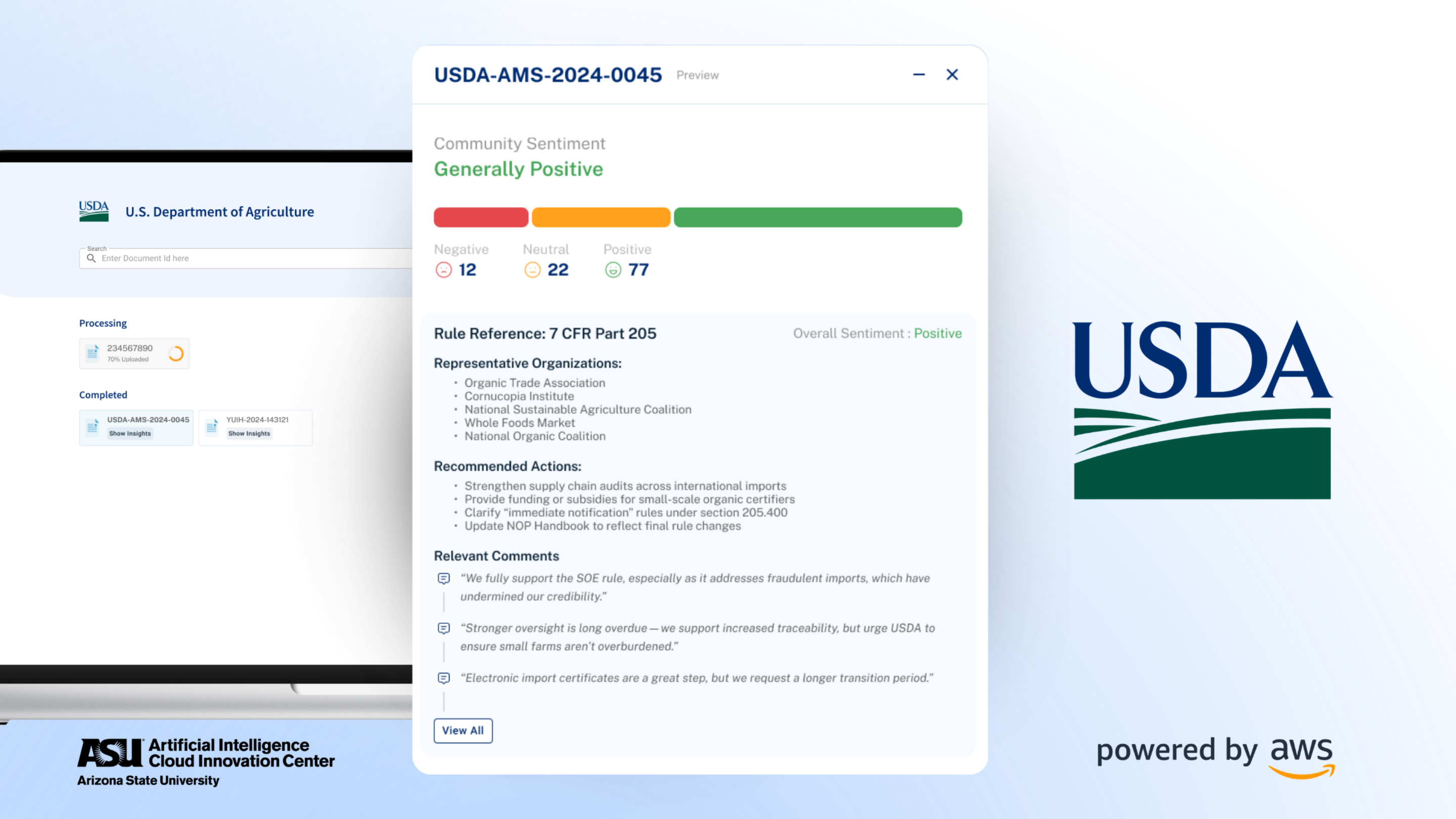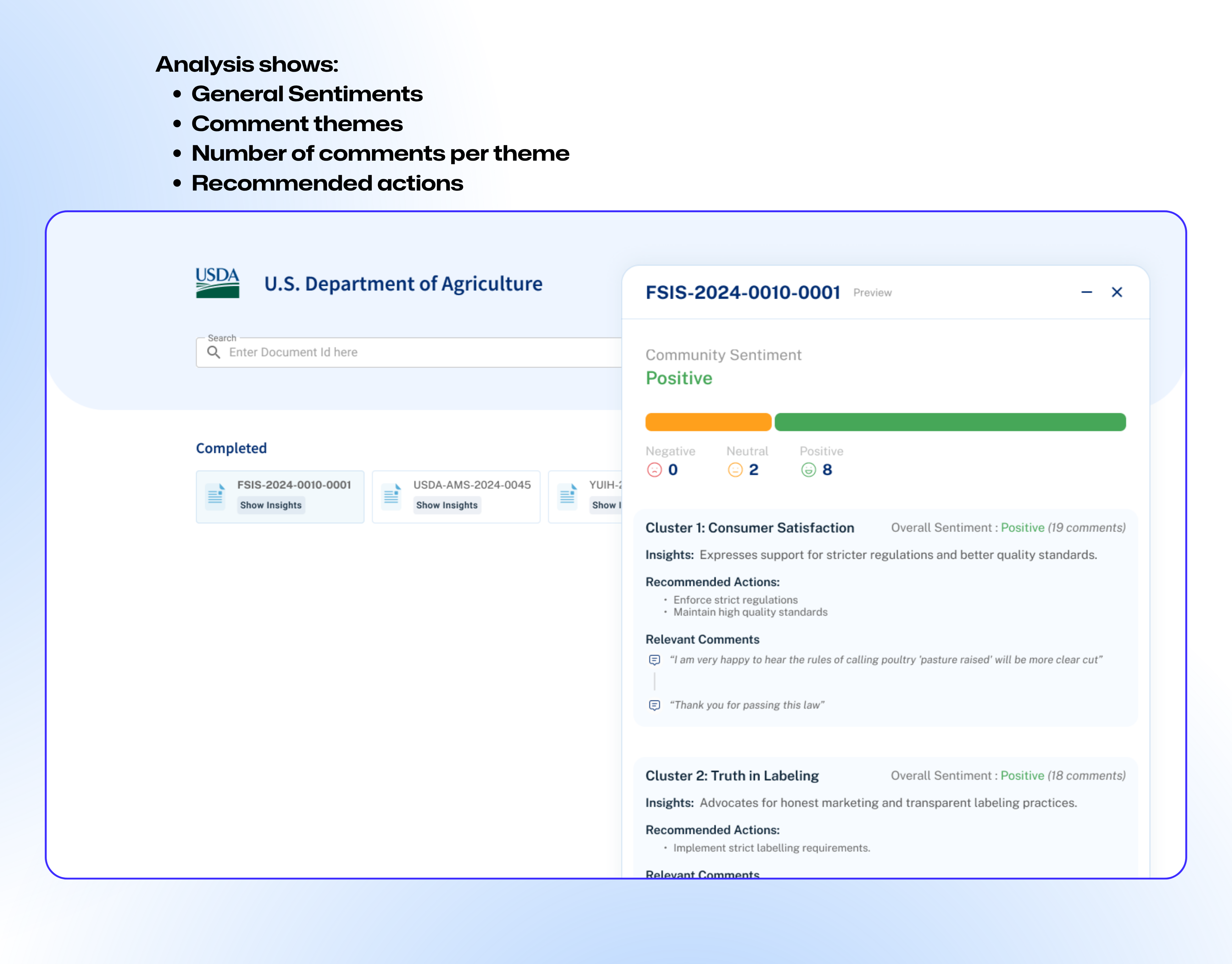 USDA receives thousands of public submissions on Regulations.gov. Manual categorizing and summarizing is slow, labor-intensive, and can miss key themes at scale. They needed automated topic modeling, sentiment analysis, AI-generated content detection, and accurate clustering/summarization.