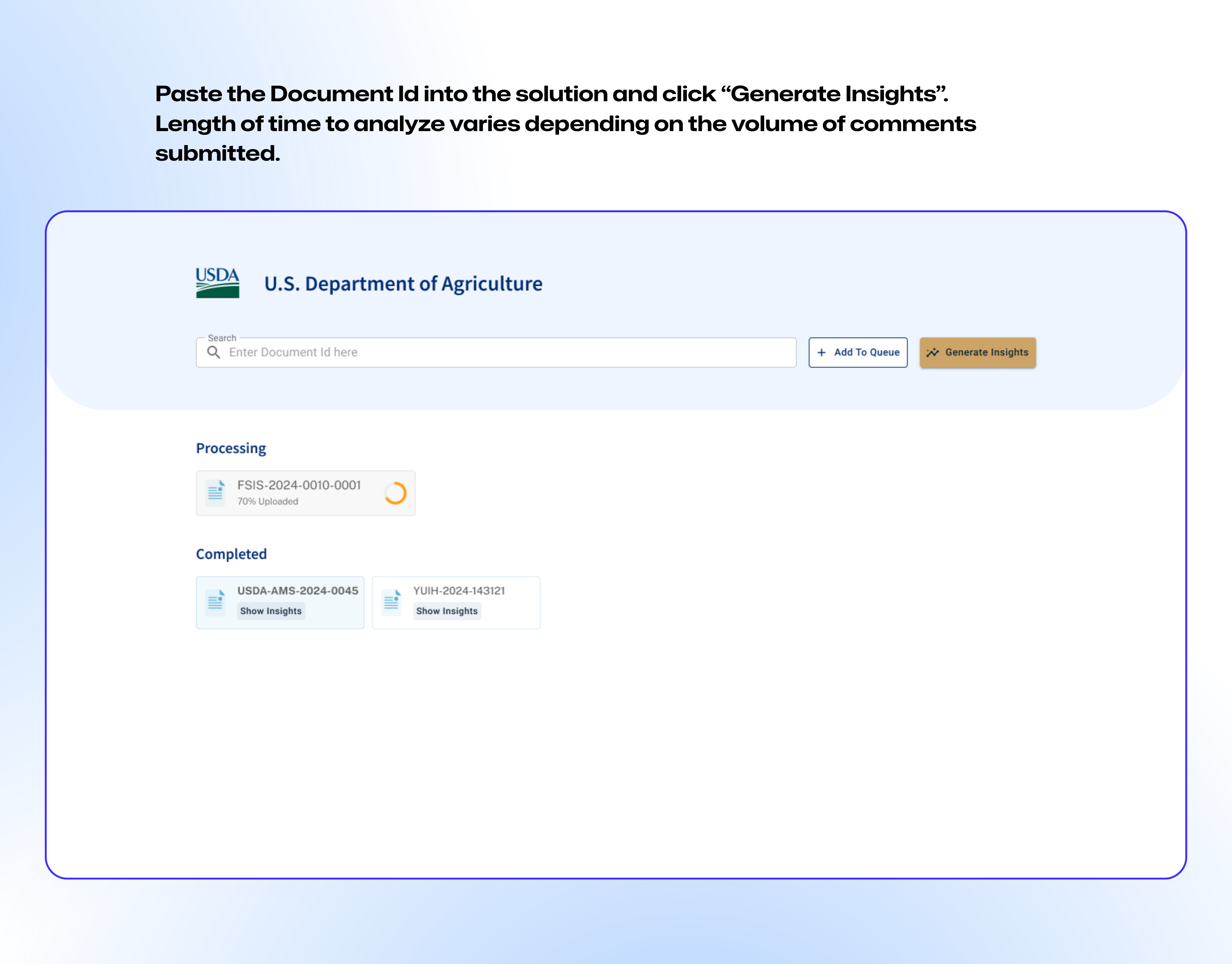 Built a React-based Public Comment Analysis portal for USDA teams to submit Regulations.gov document IDs, track multi-stage processing in real time, and open a dedicated insights view to review clustered sentiment and themes.