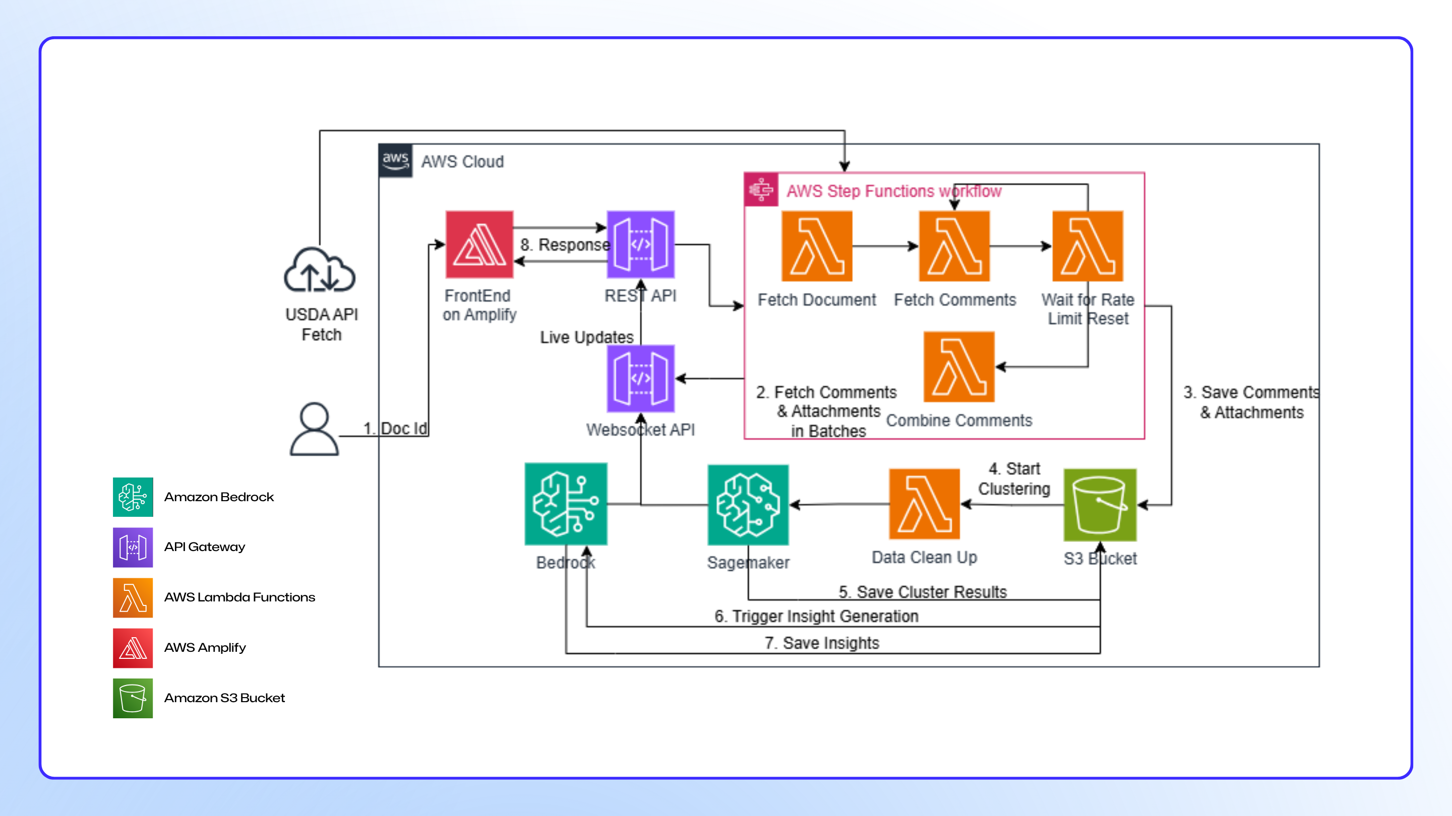 USDA Public Comment Analysis uses a serverless pipeline where the React (Amplify-hosted) UI submits a Regulations.gov document ID via API Gateway, triggers Lambda/Step Functions to ingest comments/attachments from S3, run clustering/sentiment/LLM insights, and store outputs for retrieval.